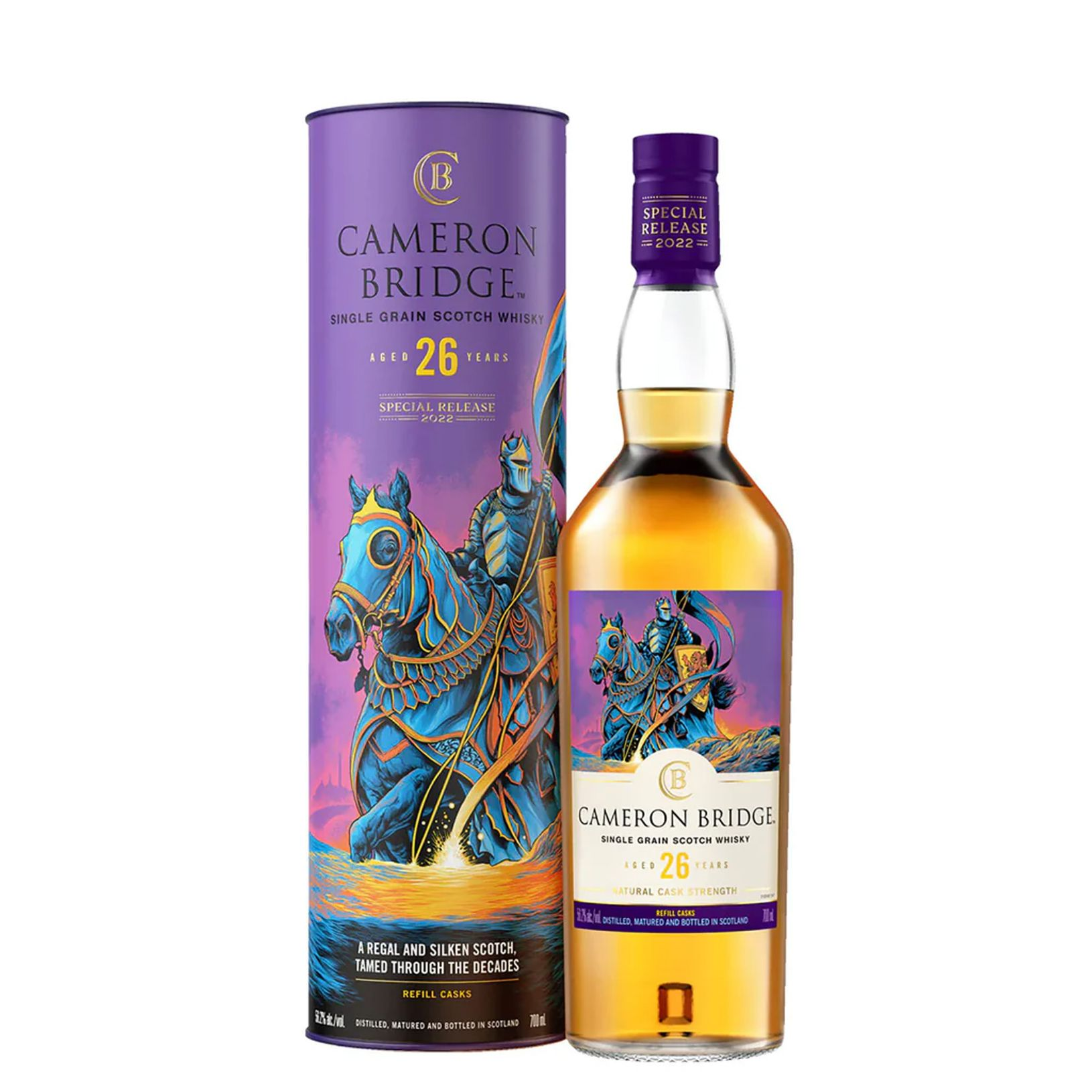As our legend goes, a brave knight forged a crown from a spirited battle lasting 26 years. Plunging through the River Ore in triumph, he carried his flag high, its long cerulean ribbons dissolving into the river’s gentle flow, transforming the water into sweet, silken gold. There, a majestic distillery was born, and as the story has it, every 26 years since, the river runs gold once again, its lustrous character present in every dram.Rising with a golden quality in 1824, Cameronbridgebecame the most enduring legacy of one of the oldest whisky dynasties. Regal, velvet and refined in its richness, its whiskies were renown for their silken and honeyed-smooth character, a taste of which rippled around the world, with loyal subjects far and wide. This bold spirit gleams gold in the sun and swirls silky-smooth in the glass. Subtle aroma yields hints of spice, these savoury notes flanked by traces of hard toffee and shavings of fine oak. The smooth flowing texture carries a taste sweet with caramel toffee and intensely oaky-dry. Living up to lore, it’s a regal spirit of abundant richness.