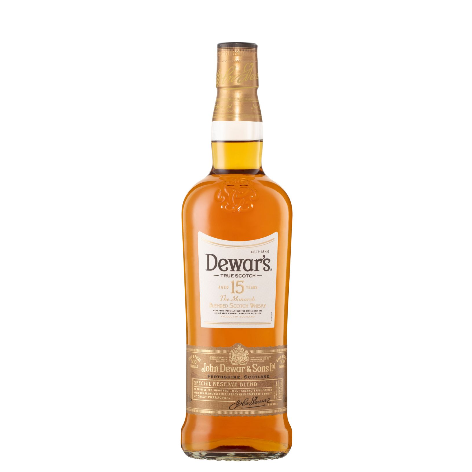 DEWAR'S 15 Year Old Blended Scotch Whisky is one of the world's most awarded whiskies. This Scotch whisky's unique taste combines malt and whisky with toffee, floral and rich honey flavours. Best enjoyed in an Elderflower Highball cocktail, served over cubed ice and soda with a long full flavour and lingering finish.