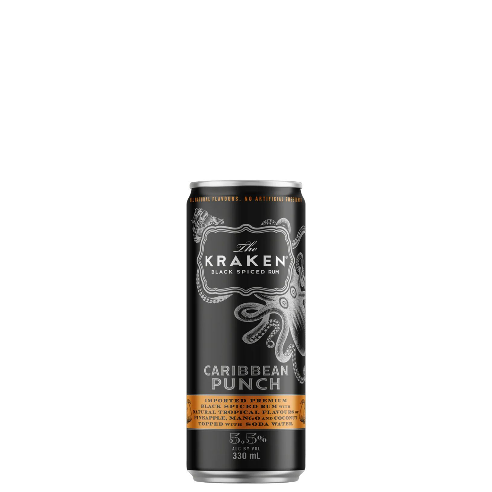 The Kraken Rum gives the classic tropical punch cocktail a Caribbean Twist. Crafted with Kraken Black Spiced Rum, and expertly mixed with natural tropical flavours of pineapple, man coconu, then topped with soda for a legendary refreshing drink. Best enjoyed with friends straight from the can or in a glass packed with ice.